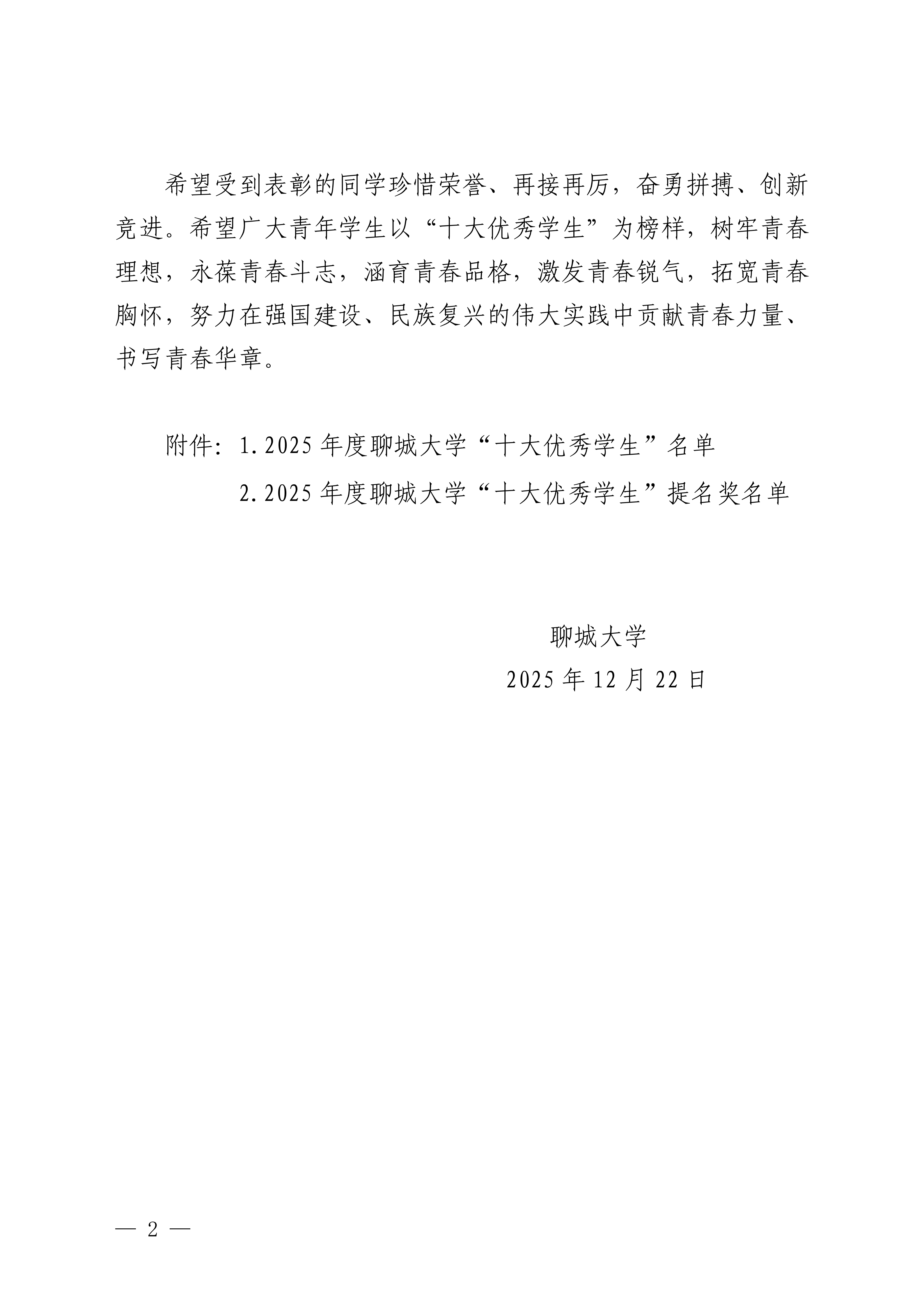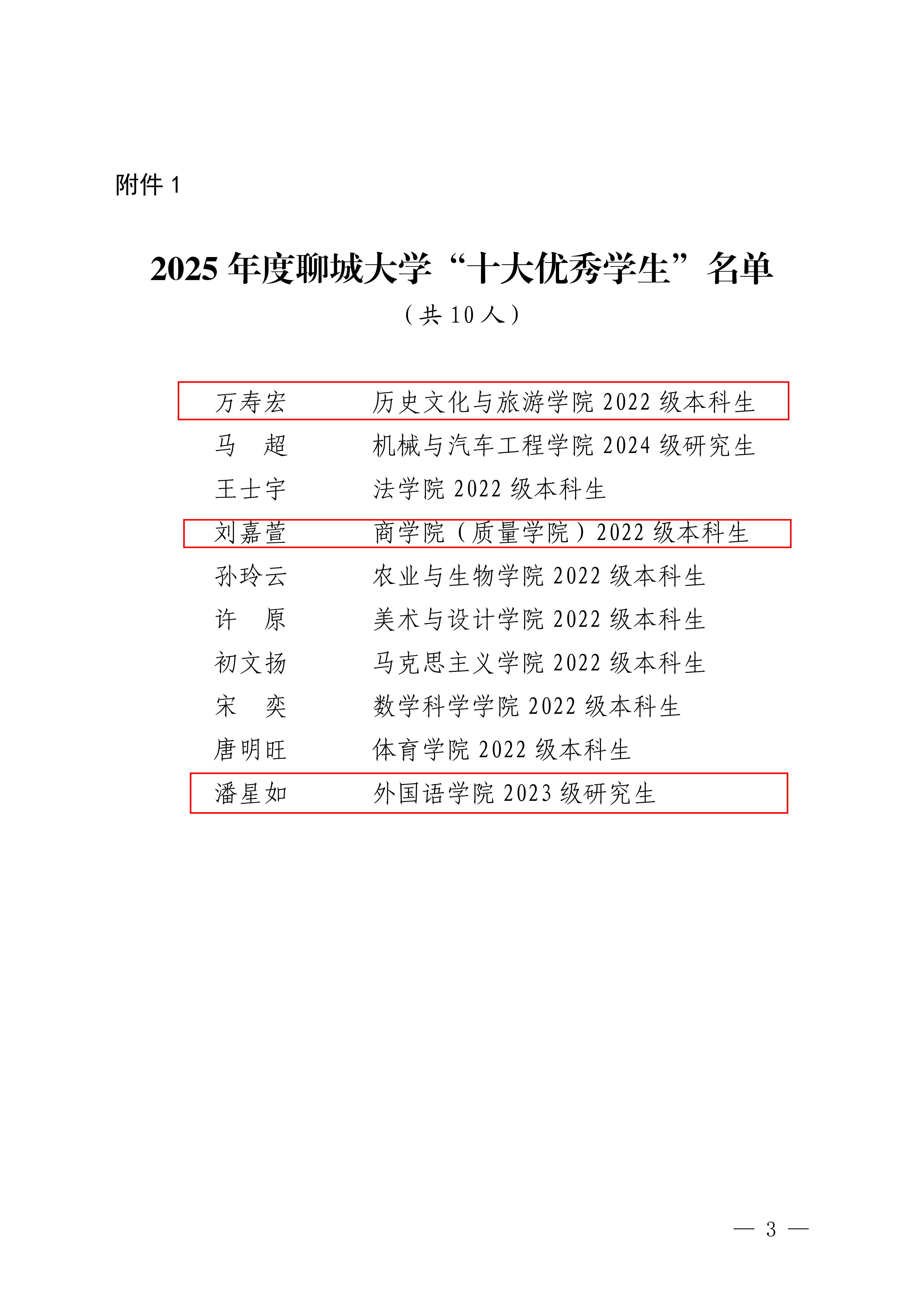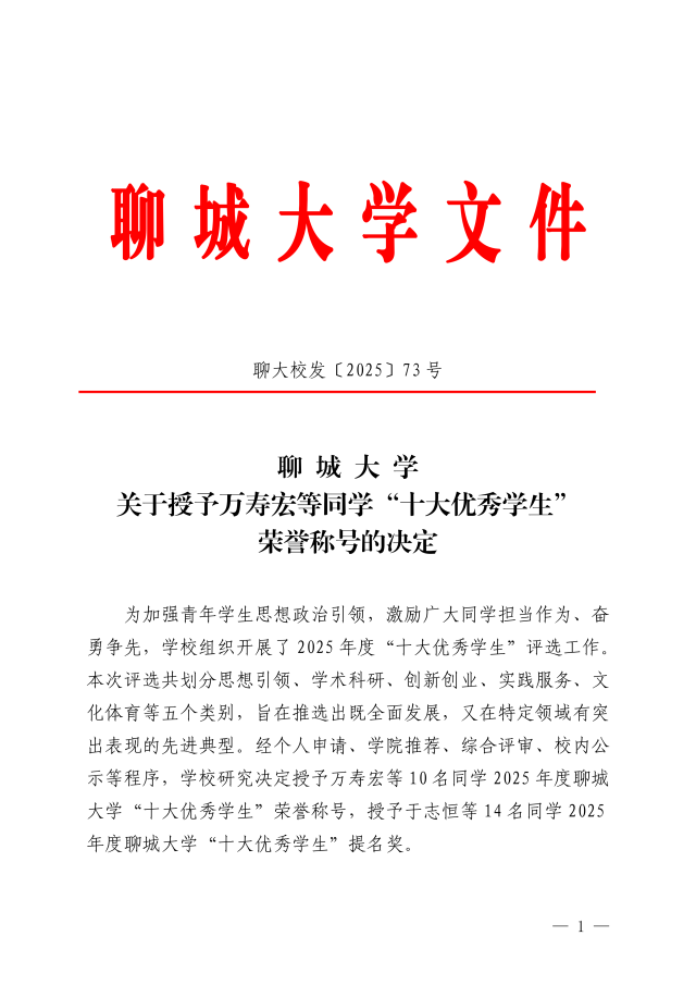 为加强青年学生思想政治引领,激励广大同学担当作为、奋勇争先,学校组织开展了2025年度“十大优秀学生”评选工作。本次评选共划分思想引领、学术科研、创新创业、实践服务、文化体育等五个类别,旨在推选出既全面发展,又在特定领域有突出表现的先进典型。经个人申请、学院推荐、综合评审、校内公示等程序,学校研究决定授予万寿宏等10名同学2025年度聊城大学“十大优秀学生”荣誉称号,授予于志恒等14名同学2025年度聊城大学“十大优秀学生”提名奖。其中,万寿宏、刘嘉萱、潘星如获得聊城大学2025年度“十大优秀学生”;于志恒、王明磊、郭铮荣获聊城大学2025年度“十大优秀学生”提名奖。6名“羡林学子”凭借优异表现,脱颖而出,光荣上榜,用亮眼成绩书写了新时代“羡林学子”的奋进篇章。